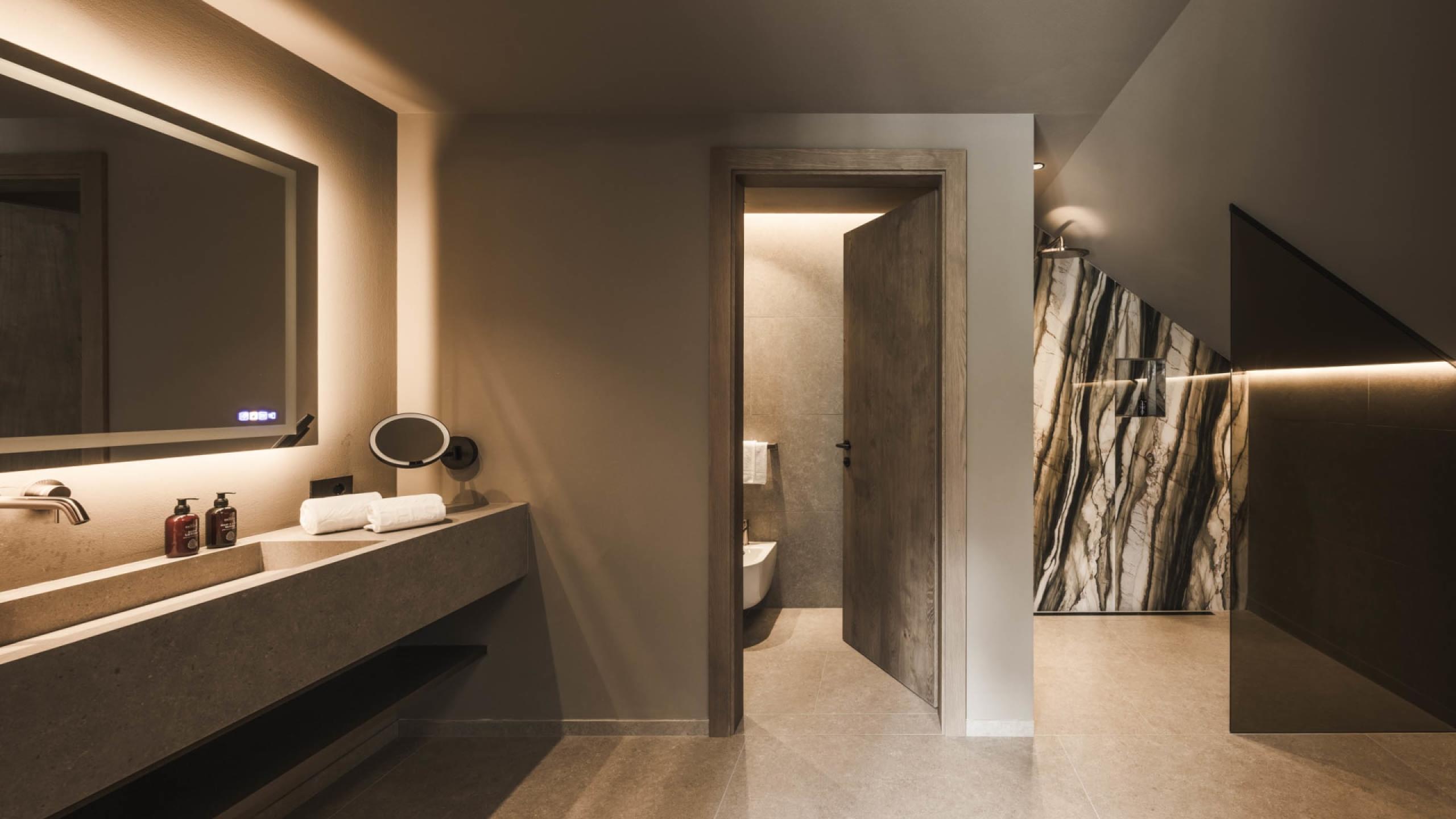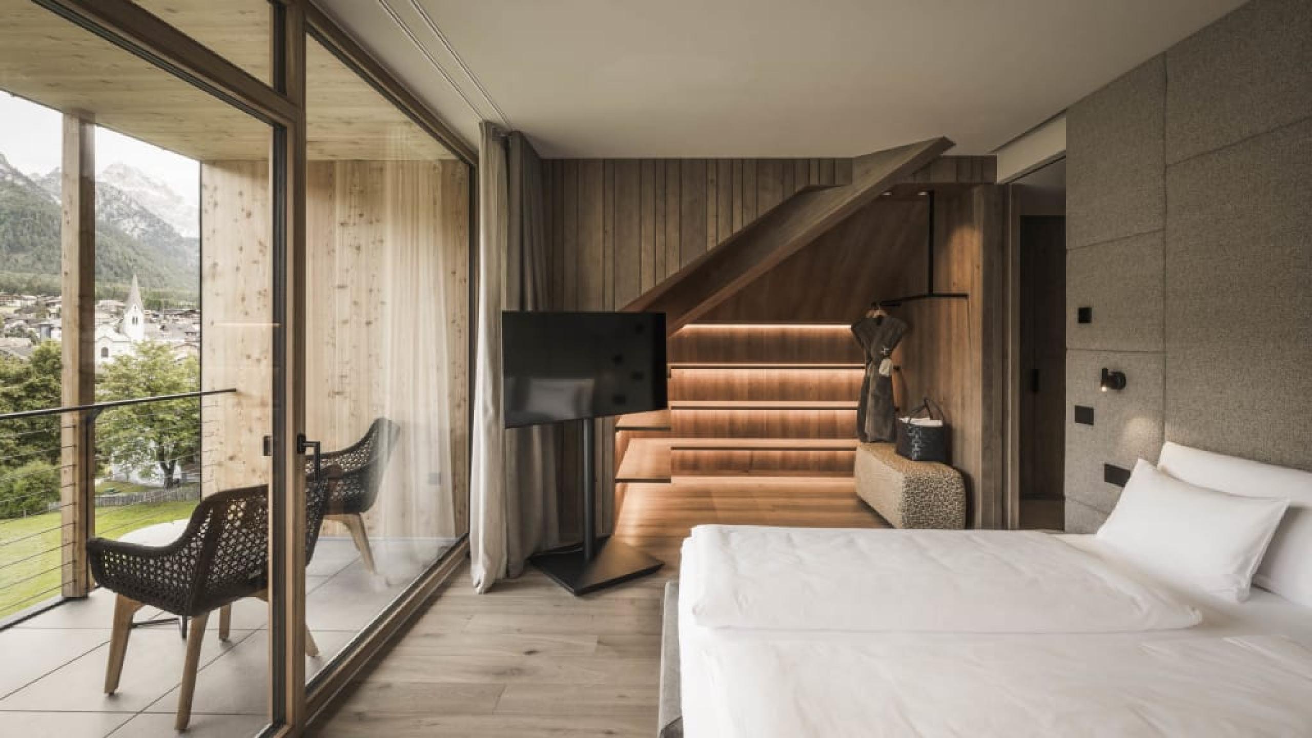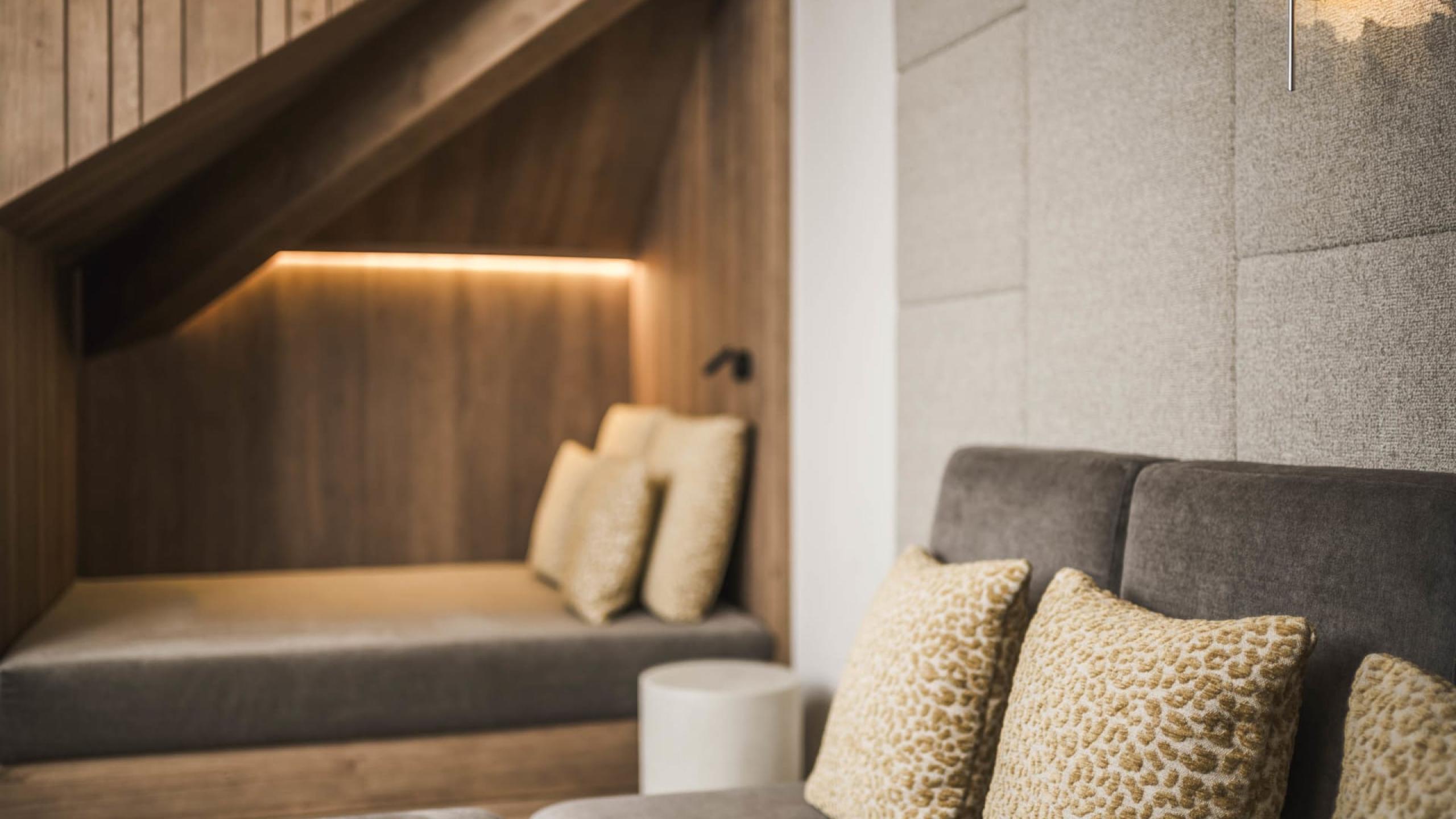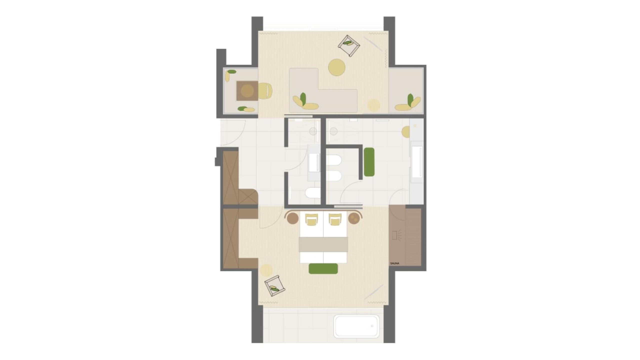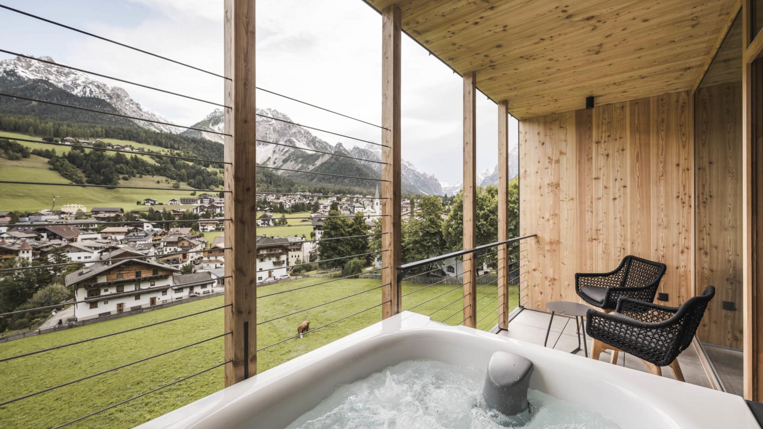 Premium suite in chalet style on the top floor with 80 m² and 20 m² balcony, natural wood furnishing and flor. Bedroom with king-size bed, separate living room with couch that converts into three separate beds if required, working table. Elegant bathroom with relaxation shower, private combined Finnish and infrared sauna, washbasin, lady make-up desk, separate WC and bidet. Second bathroom with relaxation shower, washbasin and WC. Minibar with Nespresso and tea corner, telephone, LED satellite TV, safe, free Wi-Fi. Cosy bathrobes, pool towels, slippers and backpack. Covered south-facing balcony with Jacuzzi minipool and loungers. View over the meadow, San Vigilio and the Dolomites. Garage space included. No pets allowed.