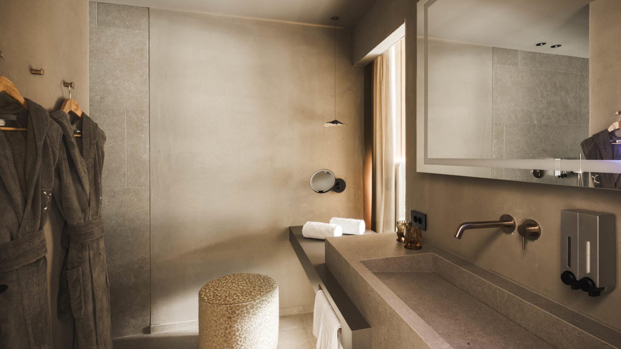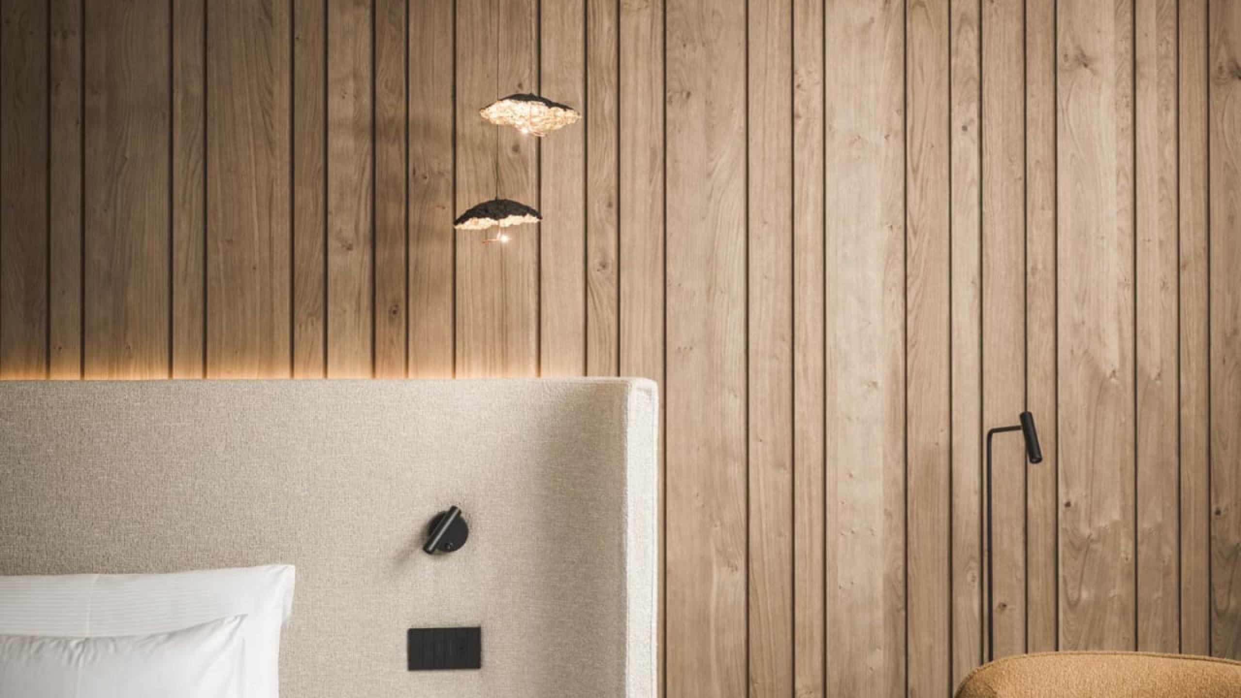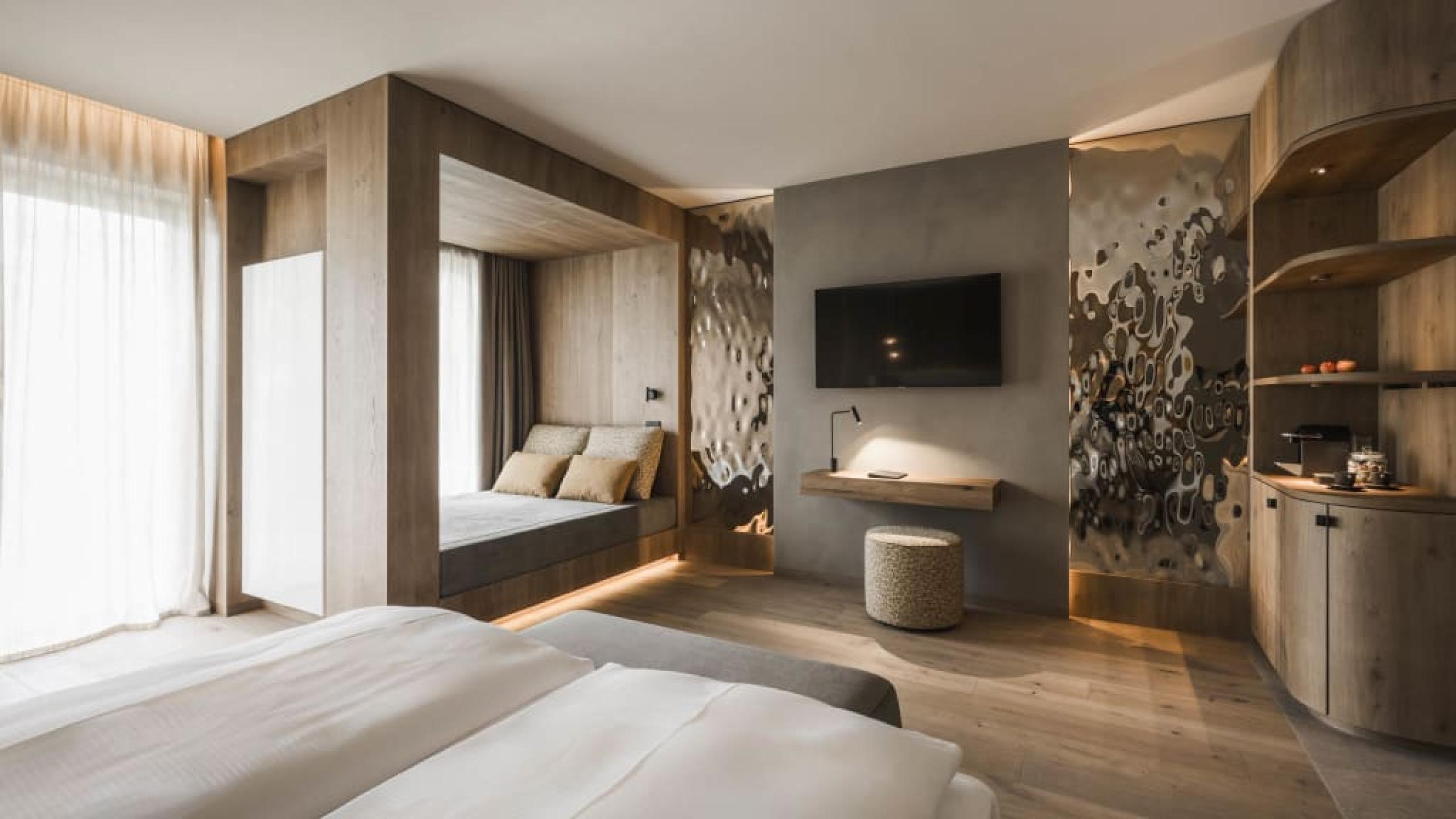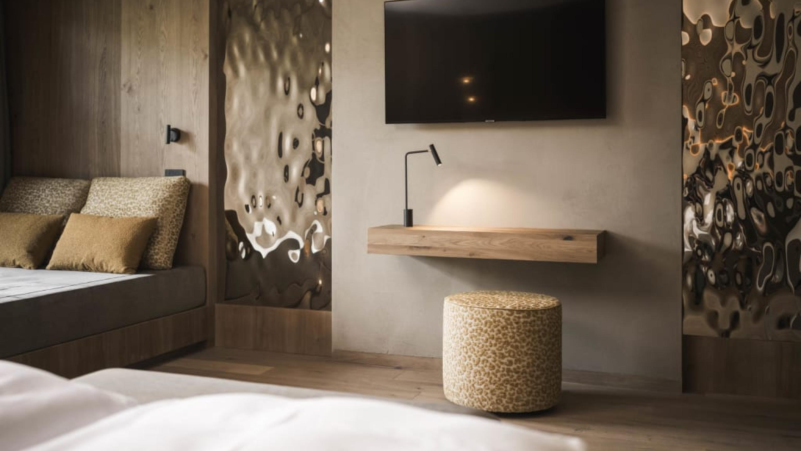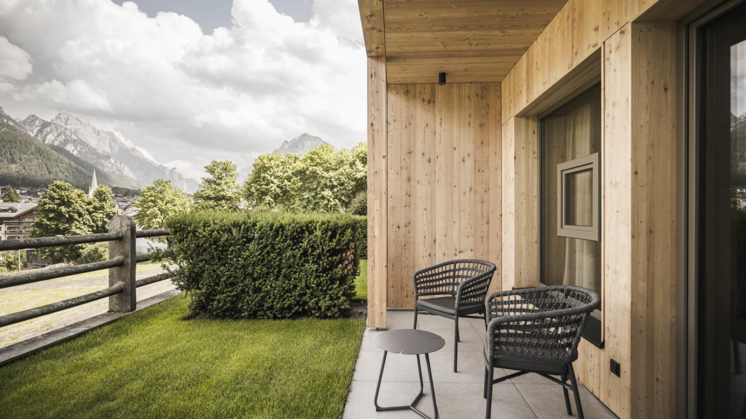 Elegant de luxe bedroom in chalet style of 44 m² with 20 m² garden terrace, natural wood furnishing and floor. King-size bed, relaxation day and night area, working table, armchair, wardrobe, bathroom with relaxation shower, lady make-up desk, washbasin, separate WC and bidet. Minibar with Nespresso and tea corner, telephone, LED satellite TV, safe, free Wi-Fi. Cosy bathrobes, pool towels, slippers and backpack. West-facing covered terrace with a view over the meadow, the village and the Dolomites. Garage space included. No pets allowed.