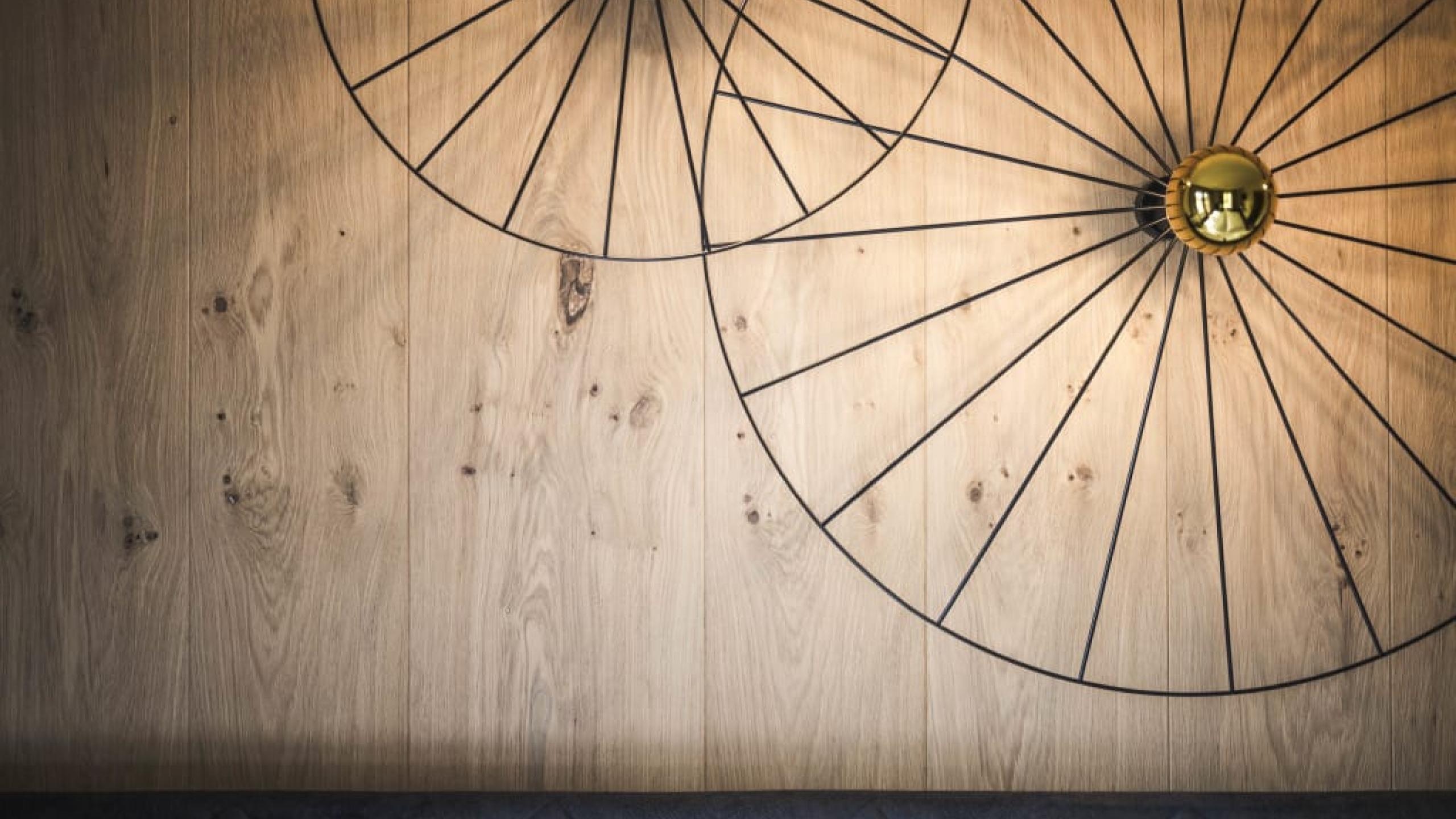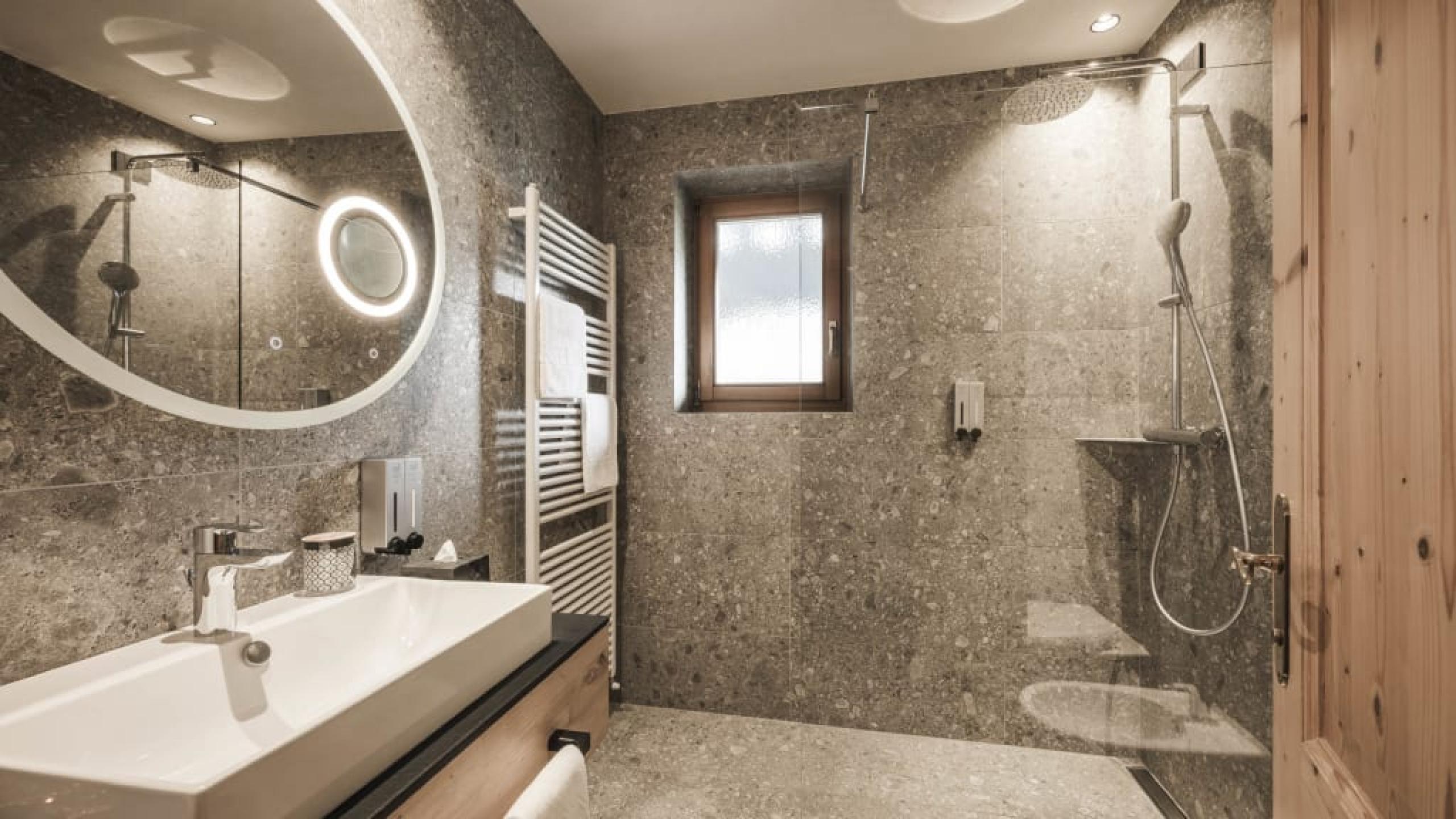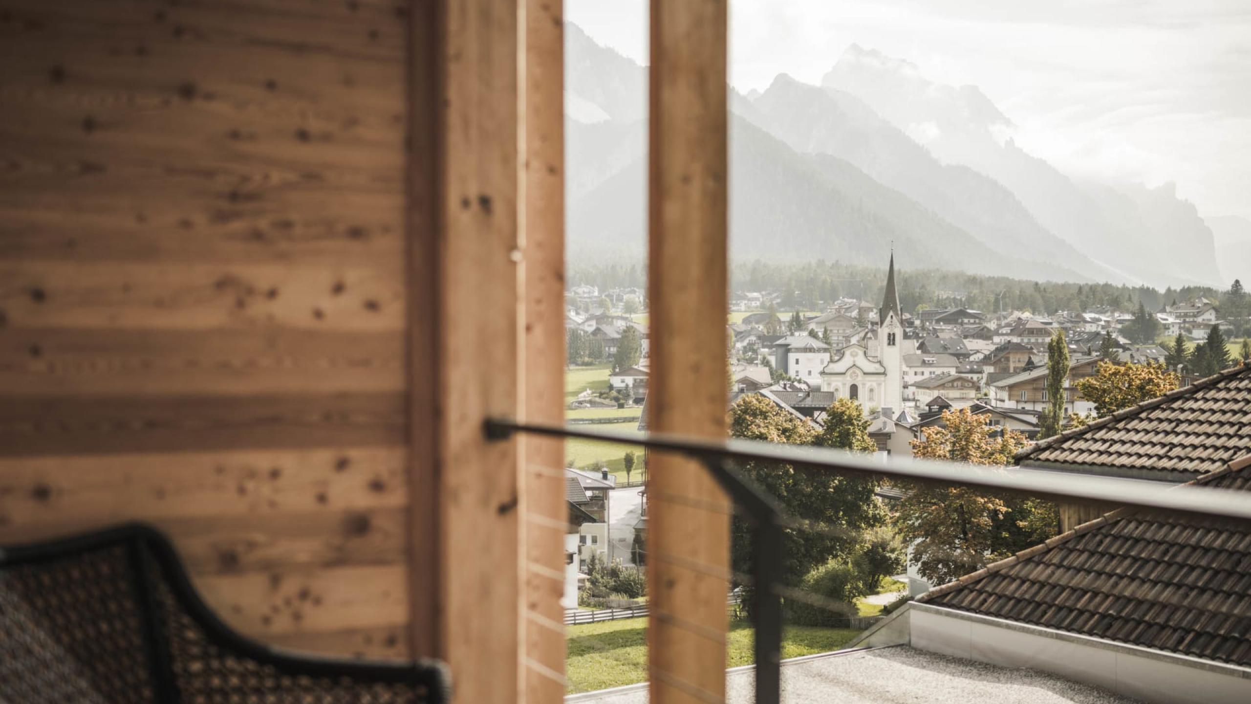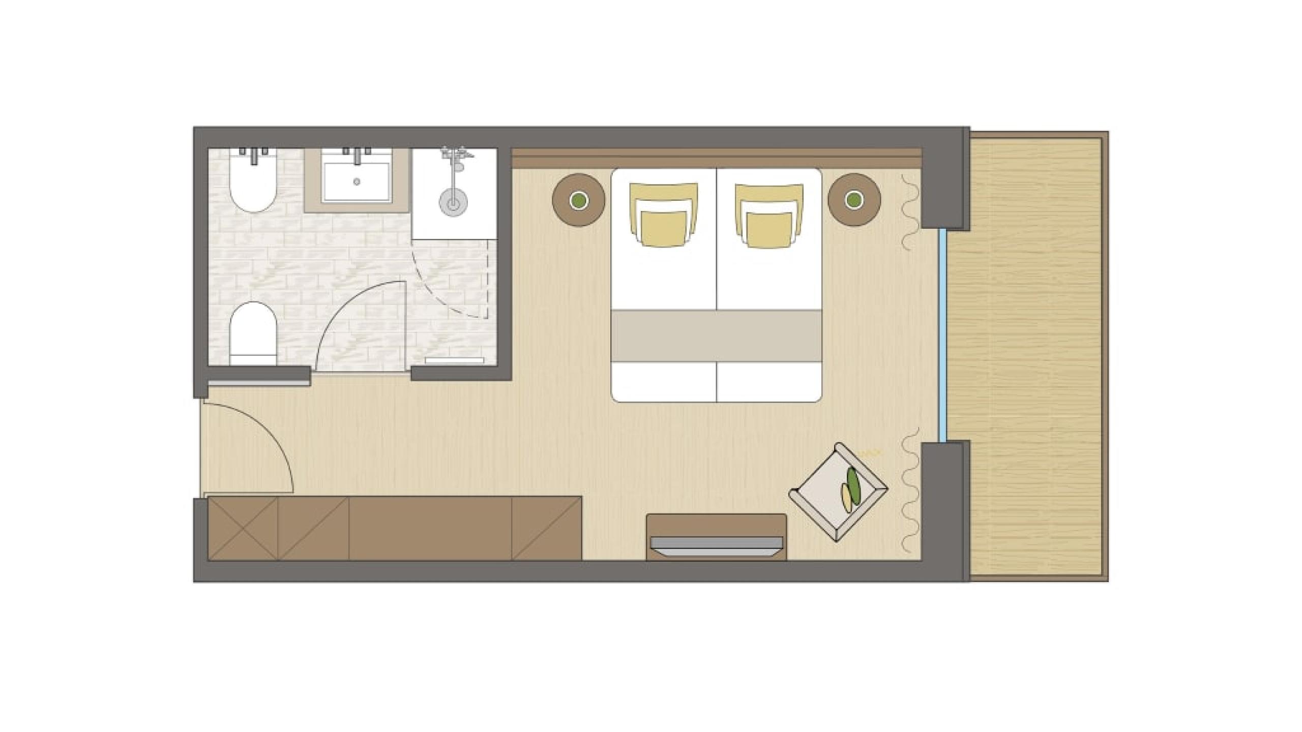 Double room in modern alpine style with 22 - 25 m² (also for single use), wood furnishing and floor. Cosy sitting area, king-size double bed, working table, bathroom with shower, WC and bidet, washbasin, make-up mirror, hairdryer, telephone, LED satellite TV, safe, minibar, free Wi-Fi. Cosy bathrobes, pool towels, slippers and backpack. Balcony with panoramic view. The images serve as an example, the furniture and the floor plan may vary.