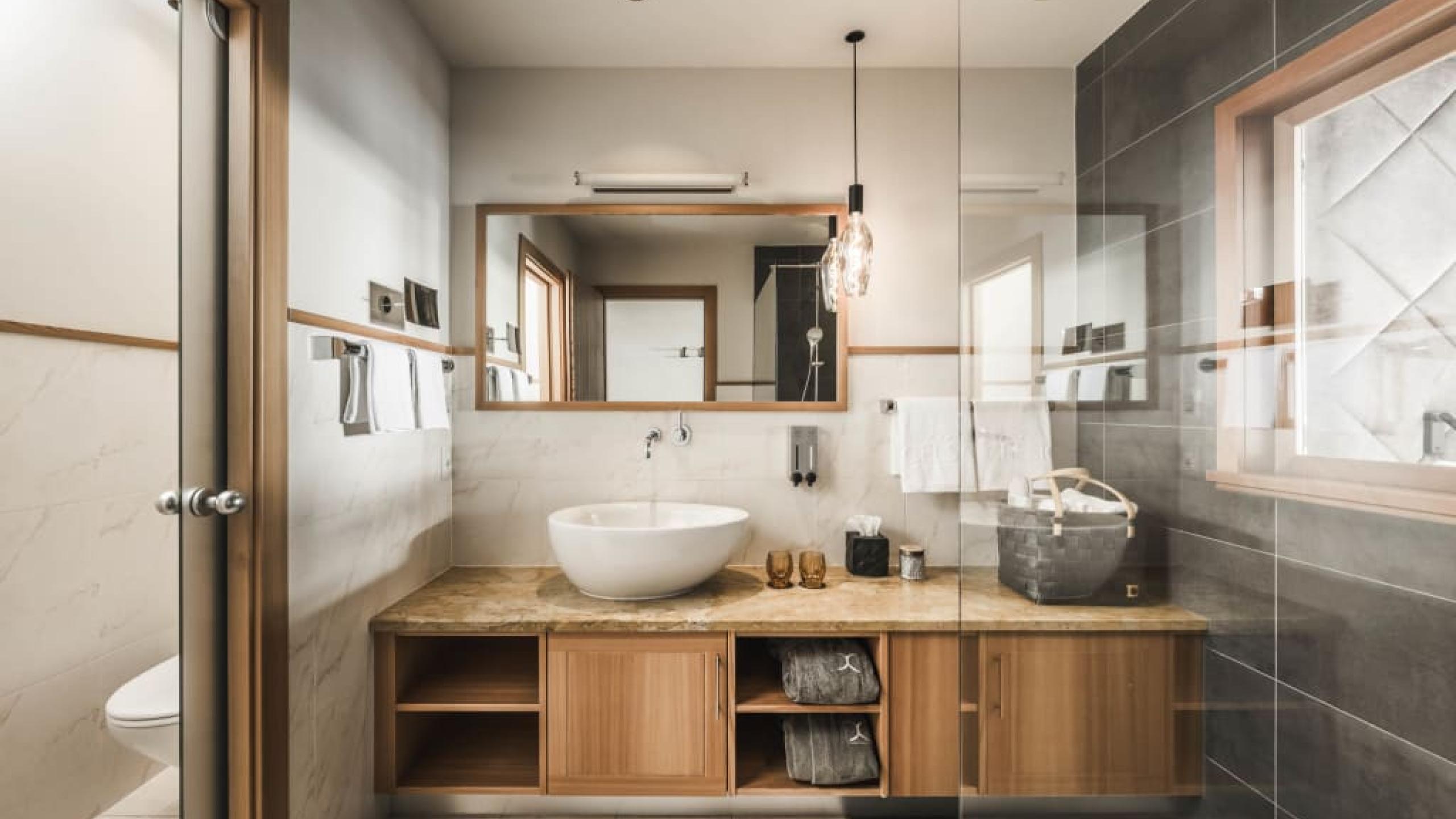 Upper floor: living/bedroom with king-size double bed and comfortable couch corner, second bathroom with shower, WC, marble washbasin.