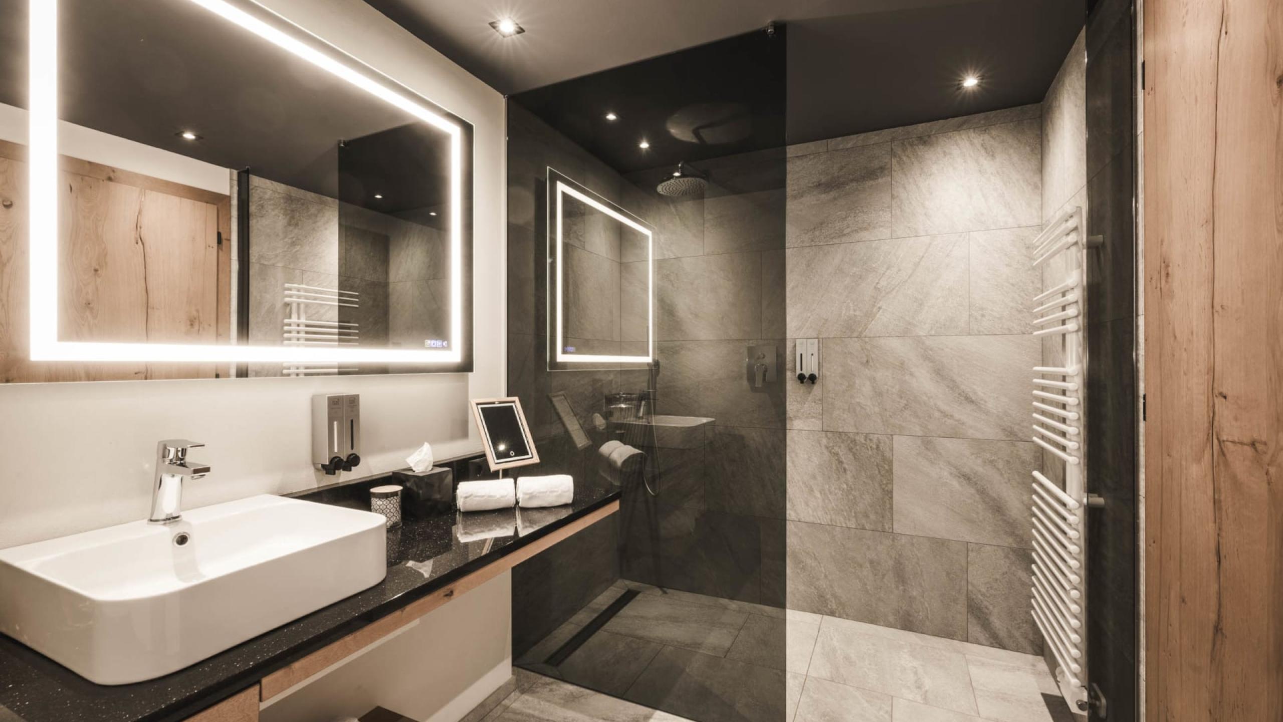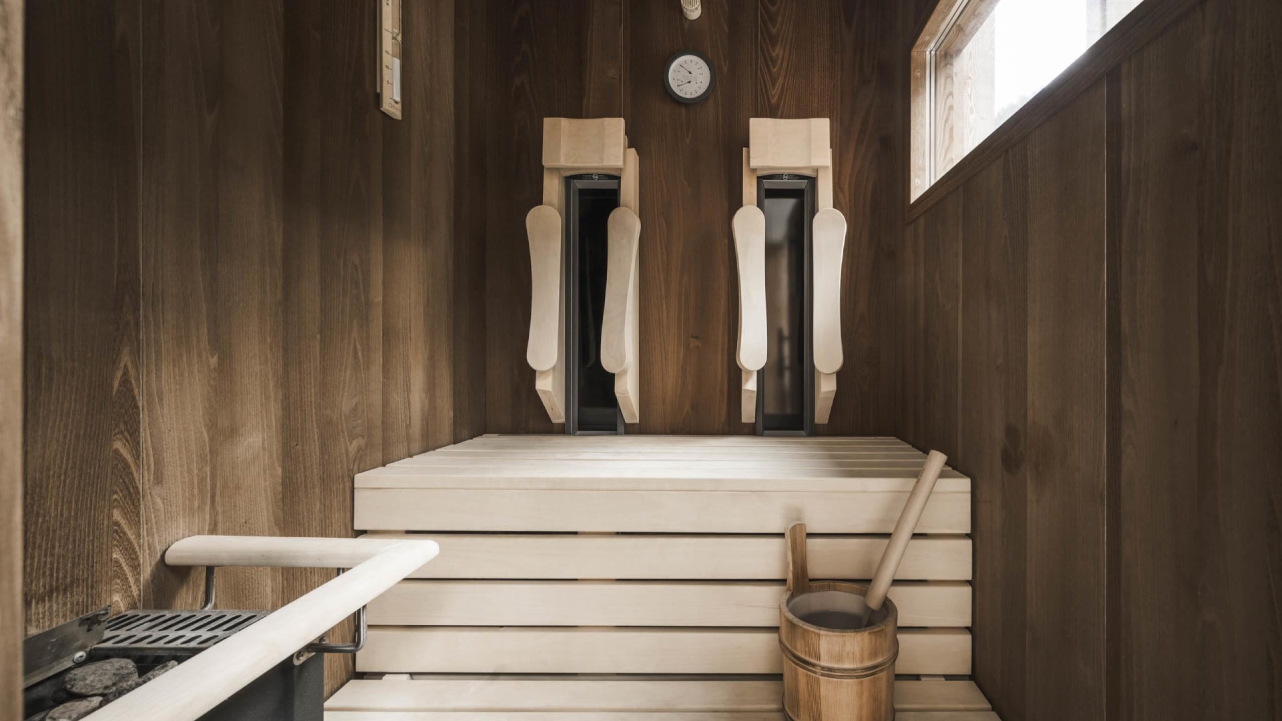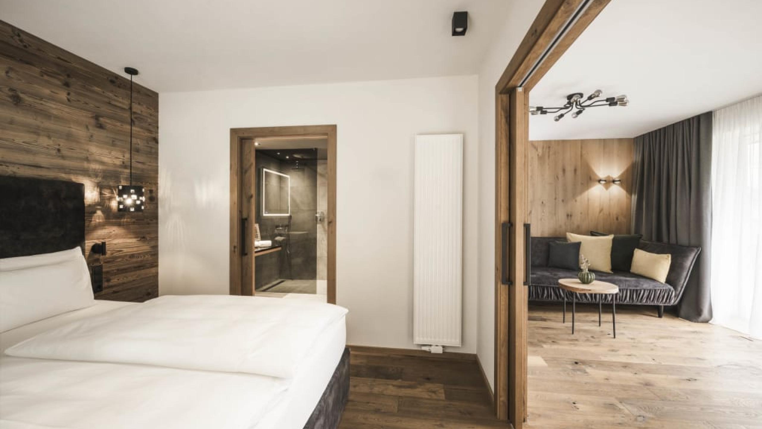 Suite familiare ad angolo de luxe in stile chalet di 70 m² con balcone di 20 m², arredamento e pavimento in legno naturale. Soggiorno con chaise longue, camera da letto con letto king-size, ulteriore camera da letto con letto castello, primo bagno de luxe con doccia relax, WC e bidet separati, lavandino doppio in marmo, angolo beauty-petinoise, secondo bagno con vasca, lavandino in marmo e WC. Minibar con angolo Nespresso e bollitore, telefono, TV satellitare a LED, cassaforte, Wi-Fi gratuito. Morbidi accappatoi, teli da piscina, ciabatte e zaino. Balcone coperto con sole pomeridiano e vista sul bosco e sauna finlandese con raggi infrarossi. Spazio garage incluso. Non sono ammessi animali domestici.