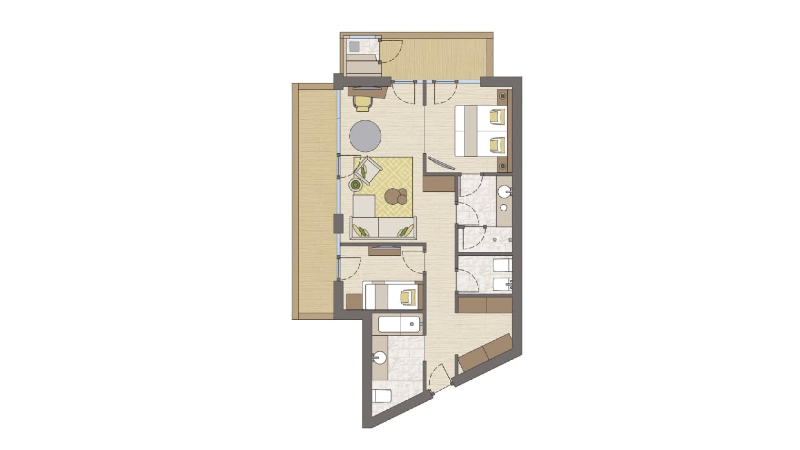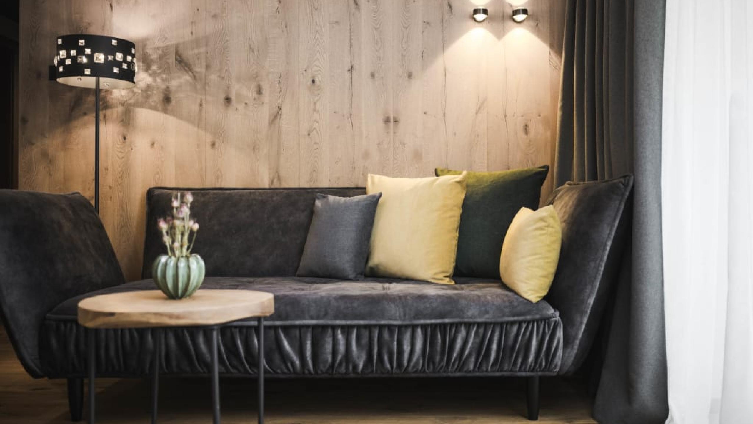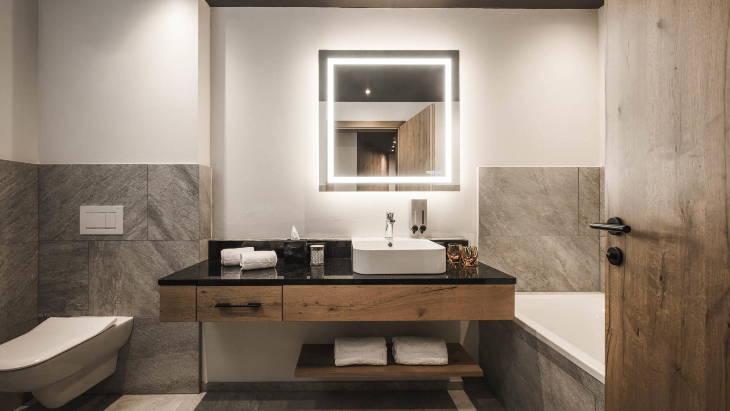 Suite familiare ad angolo de luxe in stile chalet di 70 m² con balcone di 20 m², arredamento e pavimento in legno naturale. Soggiorno con chaise longue, camera da letto con letto king-size, ulteriore camera da letto con letto castello, primo bagno de luxe con doccia relax, WC e bidet separati, lavandino doppio in marmo, angolo beauty-petinoise, secondo bagno con vasca, lavandino in marmo e WC. Minibar con angolo Nespresso e bollitore, telefono, TV satellitare a LED, cassaforte, Wi-Fi gratuito. Morbidi accappatoi, teli da piscina, ciabatte e zaino. Balcone coperto con sole pomeridiano e vista sul bosco e sauna finlandese con raggi infrarossi. Spazio garage incluso. Non sono ammessi animali domestici.