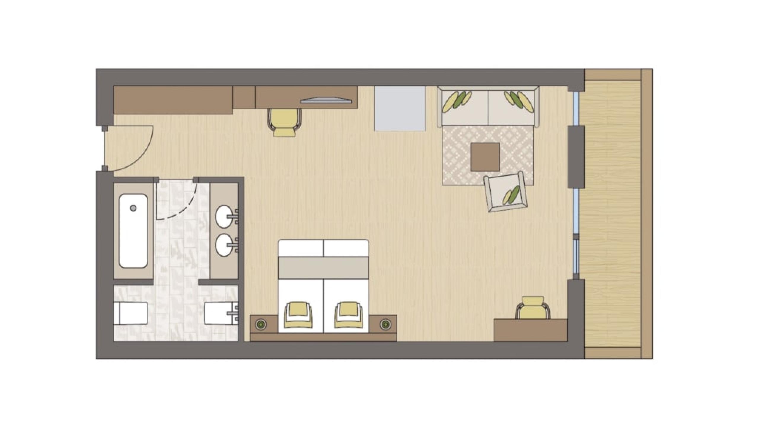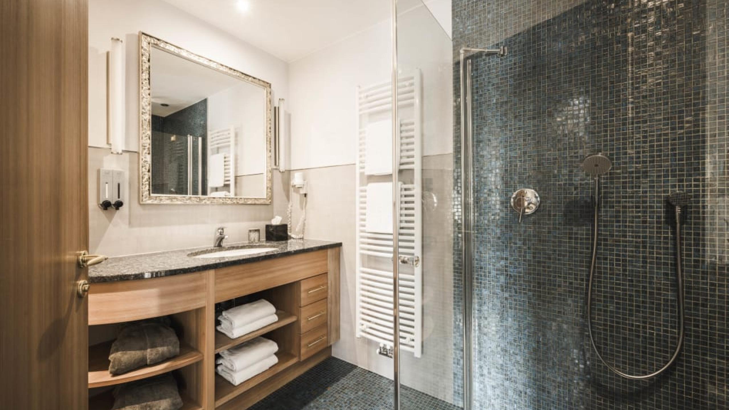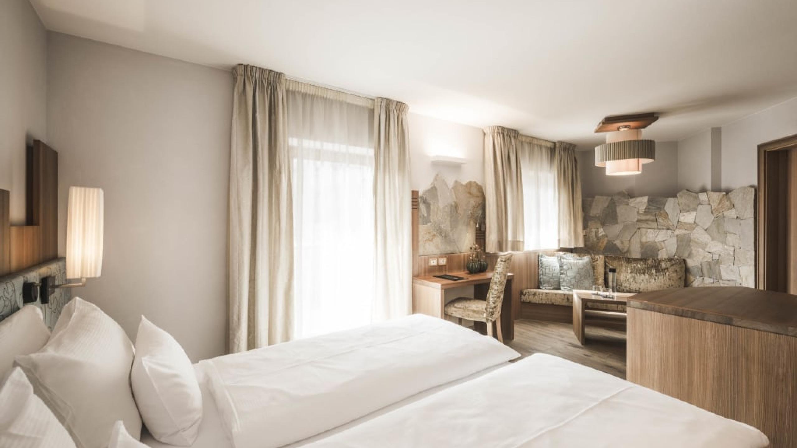 Camera de luxe Crystal, Rubin, Acquamarin o Smaragd di 30 - 37 m², arredamento e pavimento in legno naturale. Accogliente angolo relax, letto matrimoniale king-size, scrivania, bagno con vasca o doccia con design in pietre preziose, alcune dispongono di WC e bidet separati. Lavandino in marmo, specchio per la cosmesi, asciugacapelli, telefono, TV satellitare a LED, cassaforte, minibar, Wi-Fi gratuito. Morbidi accappatoi, teli da piscina, ciabatte e zaino. Balcone con vista panoramica. Spazio garage incluso. La disposizione e l’arredamento delle camere possono variare.