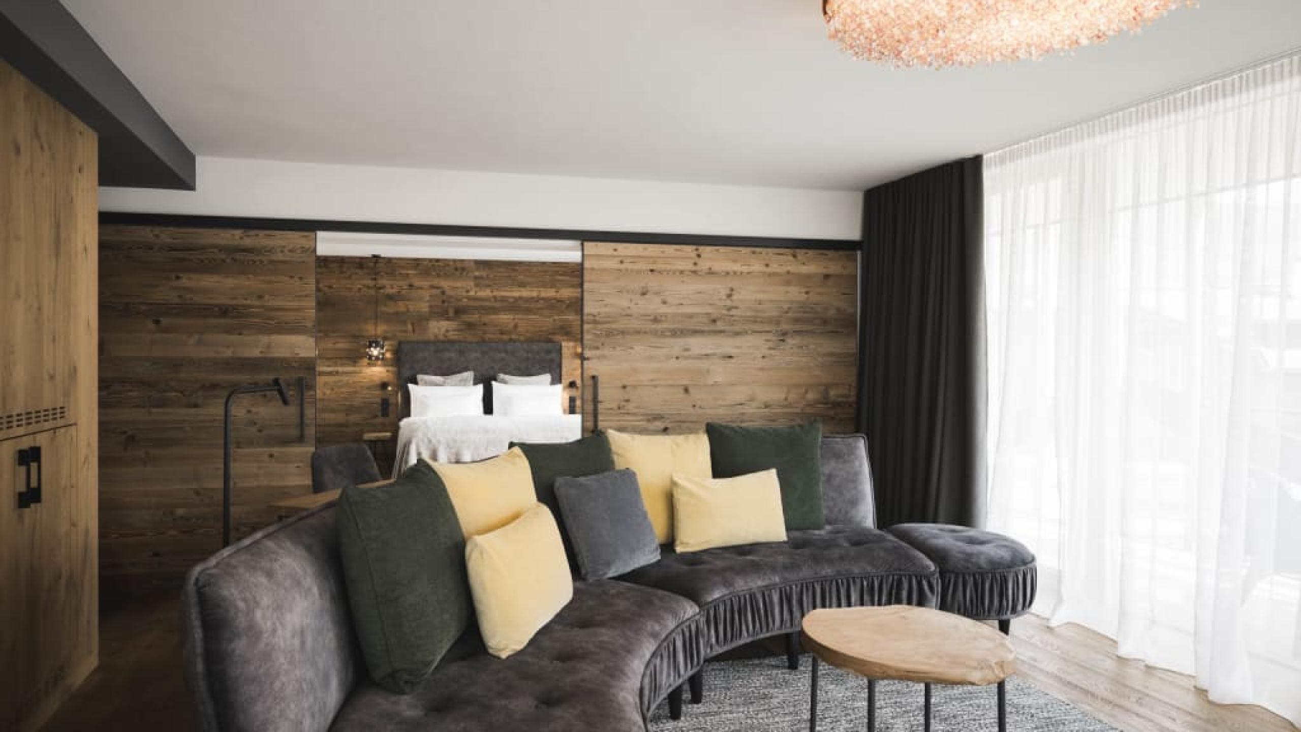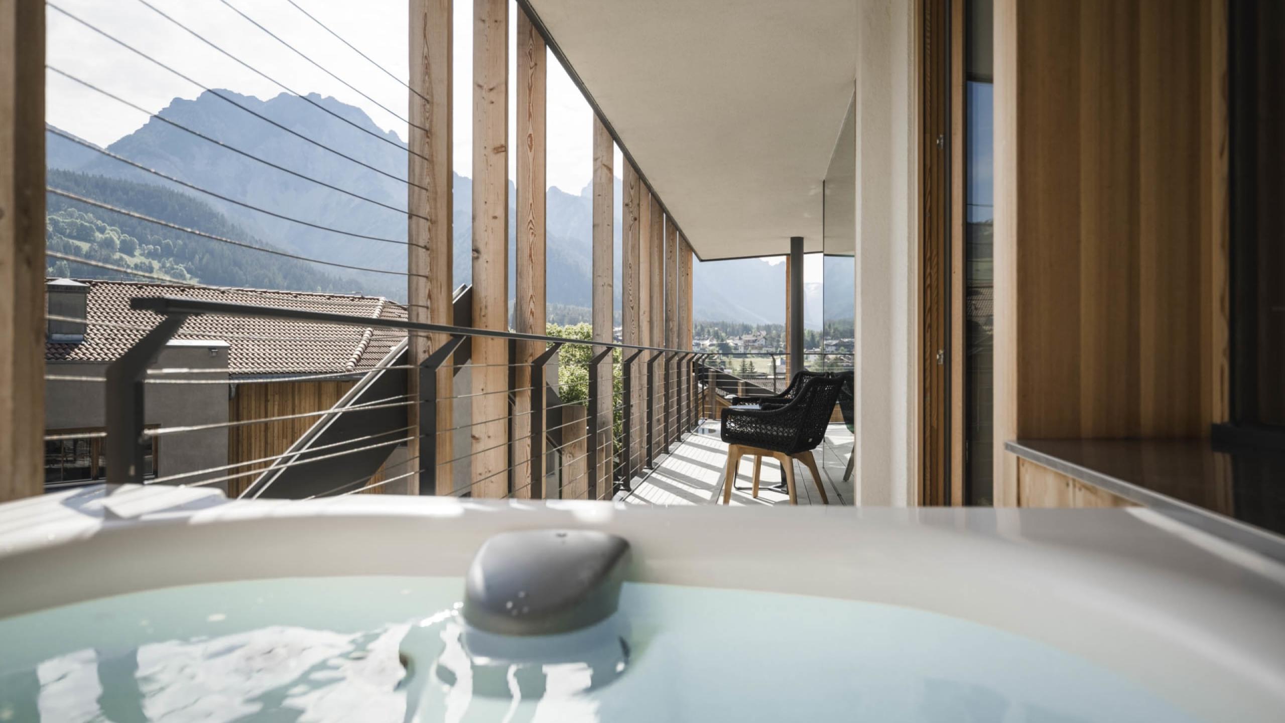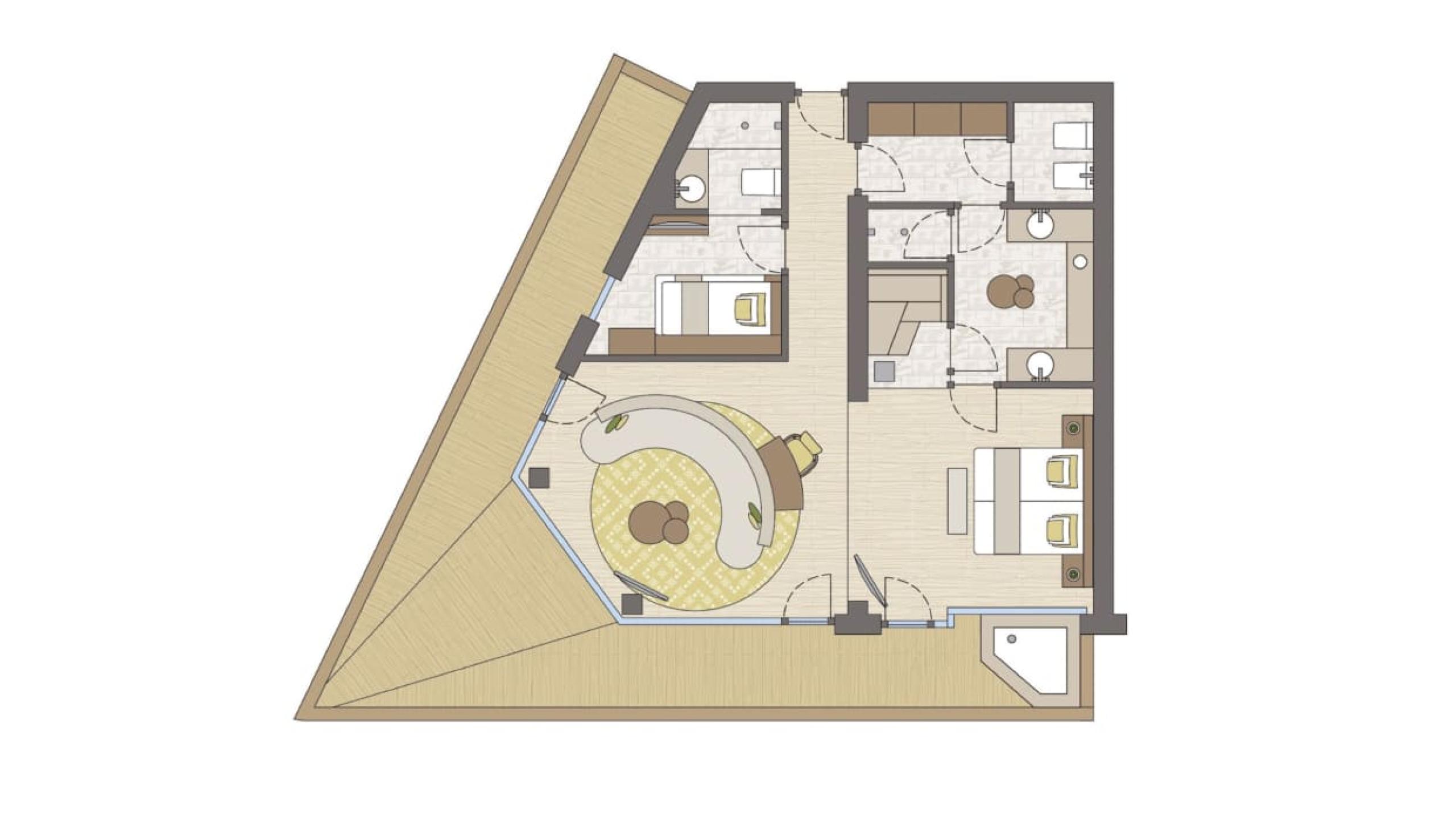 Premium-Suite im Chalet-Stil mit 80 m² und 20 m² Loggia, Naturholzausstattung und Naturholzboden. Schlafzimmer mit Kingsize-Doppelbett, zweites Schlafzimmer mit Stockbett, getrenntes Wohnzimmer mit Chaise Longue, Schreib-/Arbeitstisch, Schrank, elegantes Badezimmer mit großzügiger Relax-Dusche, private kombinierte Finnische- und Infrarotsauna, WC und Bidet getrennt, Doppelwaschtisch in Marmor, Lady-Schmink-Desk, zweites Badezimmer mit großzügiger Relax-Dusche, WC, Waschbecken in Marmor. Minibar mit Nespresso und Tee-Ecke, Telefon, LED Sat-TV, Safe, kostenloses WLAN. Kuschelige Bademäntel, Badetücher, Badeschuhe, Rucksack. Überdachte Loggia zur Südseite mit Minipool Jacuzzi und komfortablen Liegen. Garagenplatz inkludiert. Keine Haustiere erlaubt.
