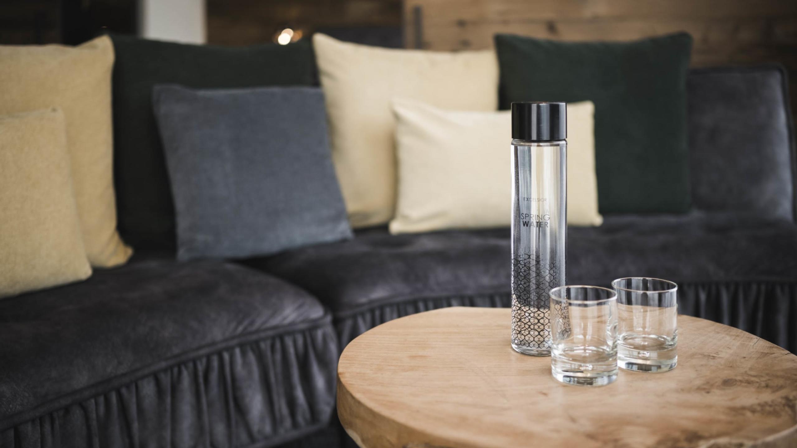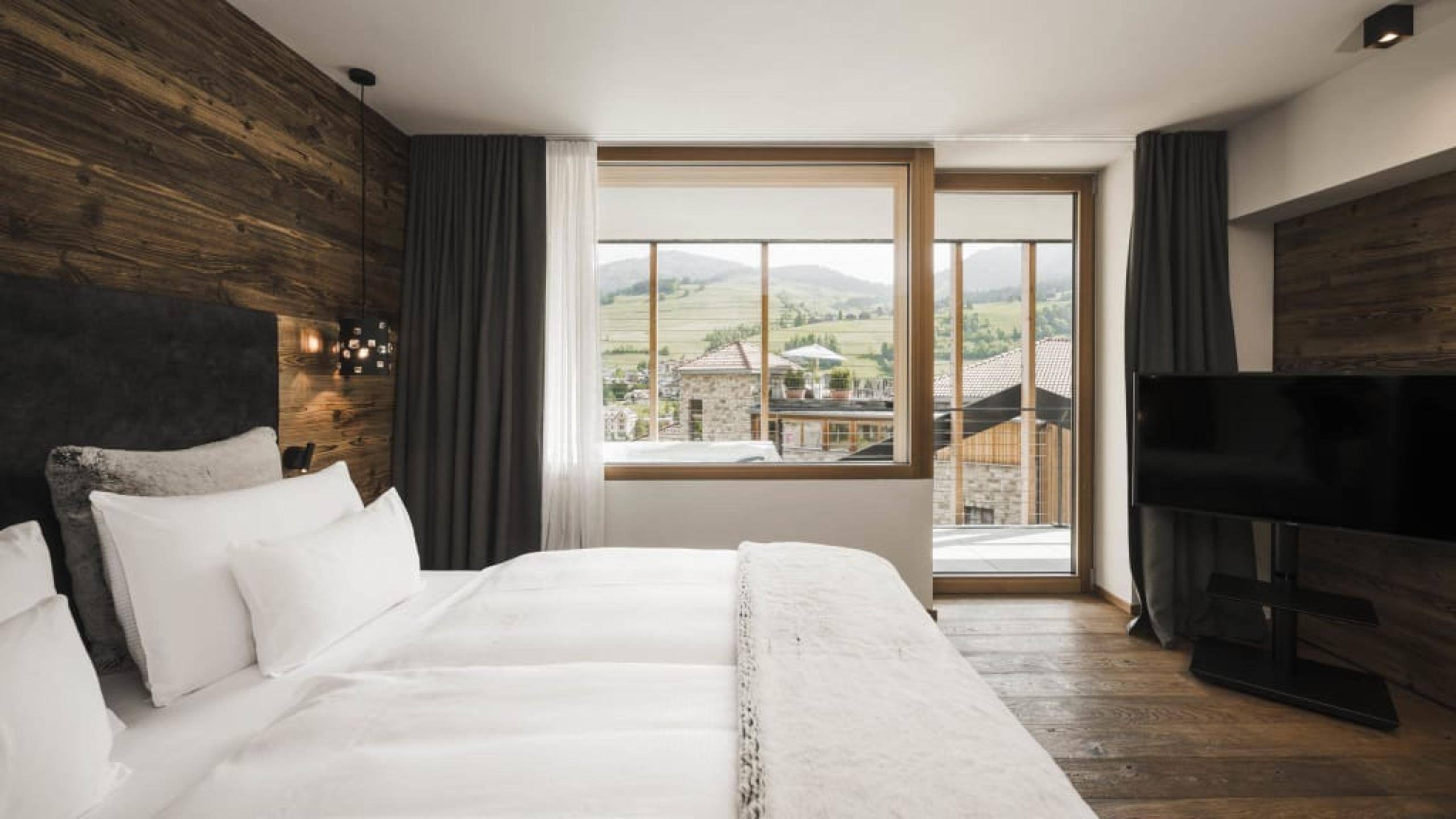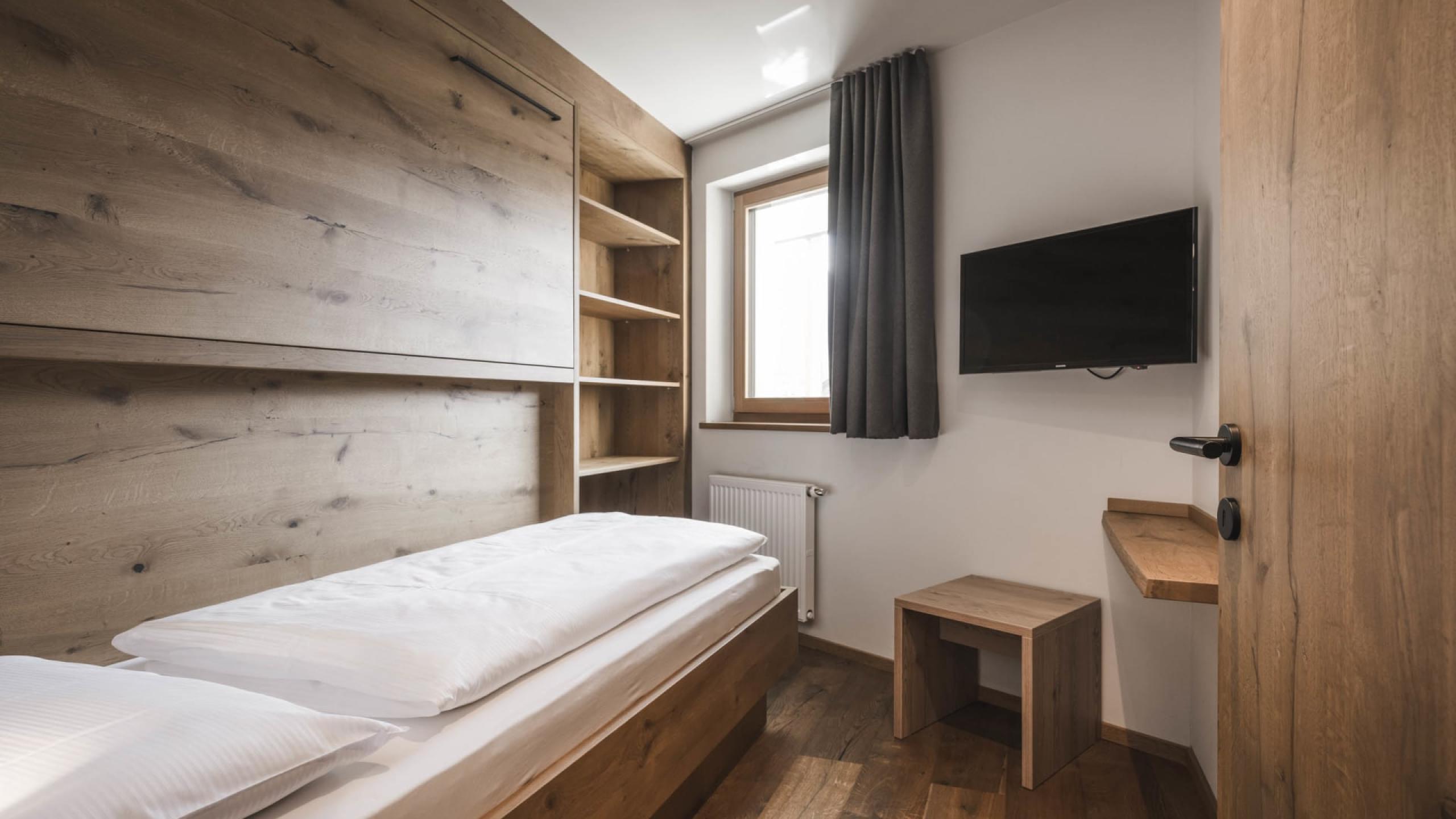 Premium-Suite im Chalet-Stil mit 80 m² und 20 m² Loggia, Naturholzausstattung und Naturholzboden. Schlafzimmer mit Kingsize-Doppelbett, zweites Schlafzimmer mit Stockbett, getrenntes Wohnzimmer mit Chaise Longue, Schreib-/Arbeitstisch, Schrank, elegantes Badezimmer mit großzügiger Relax-Dusche, private kombinierte Finnische- und Infrarotsauna, WC und Bidet getrennt, Doppelwaschtisch in Marmor, Lady-Schmink-Desk, zweites Badezimmer mit großzügiger Relax-Dusche, WC, Waschbecken in Marmor. Minibar mit Nespresso und Tee-Ecke, Telefon, LED Sat-TV, Safe, kostenloses WLAN. Kuschelige Bademäntel, Badetücher, Badeschuhe, Rucksack. Überdachte Loggia zur Südseite mit Minipool Jacuzzi und komfortablen Liegen. Garagenplatz inkludiert. Keine Haustiere erlaubt.