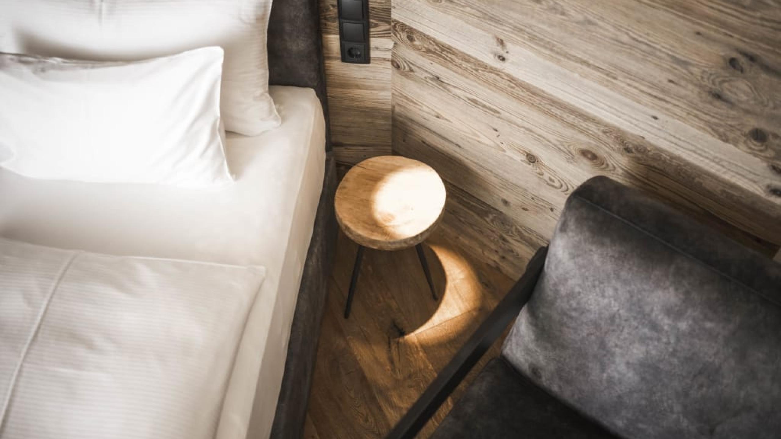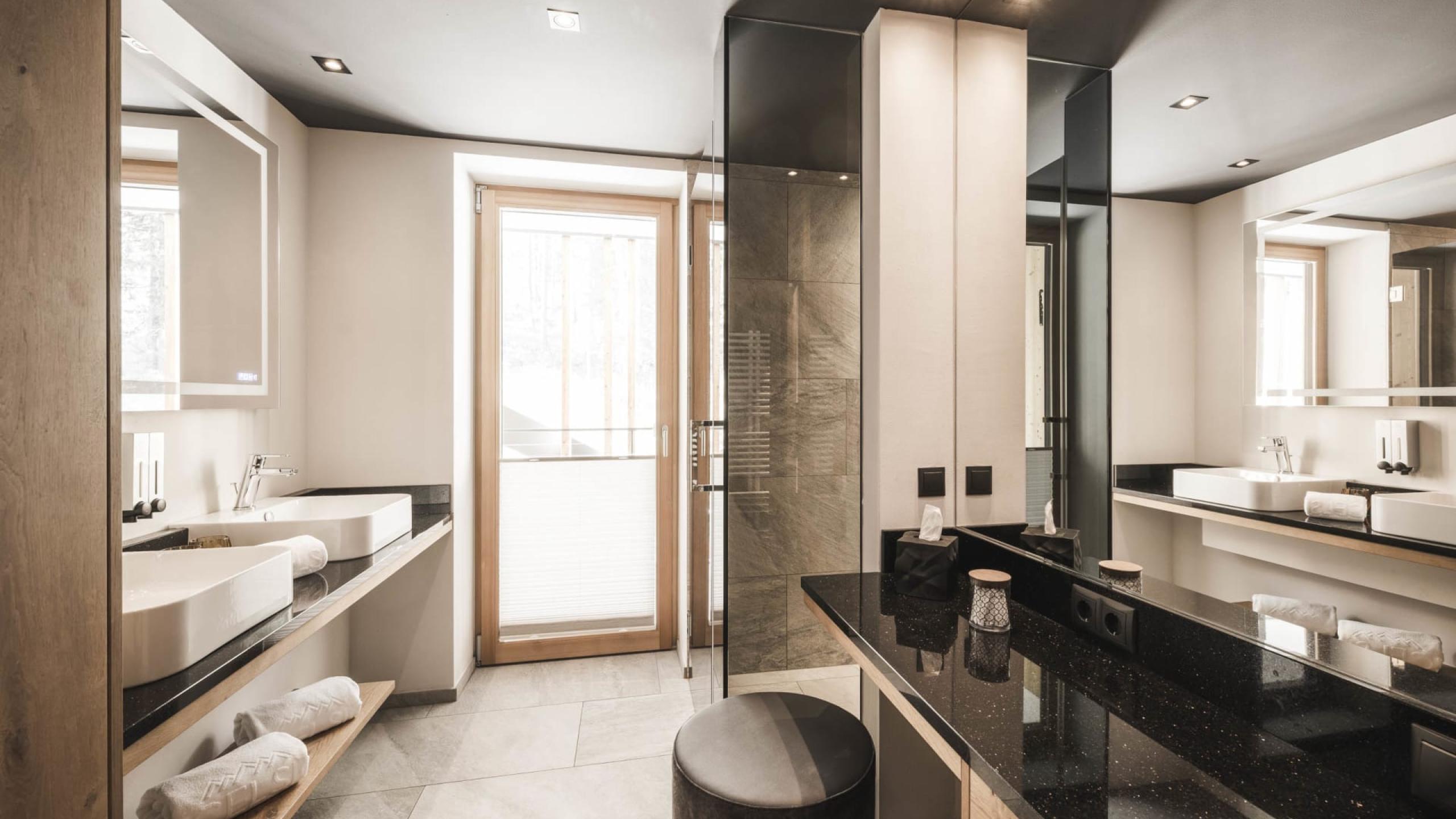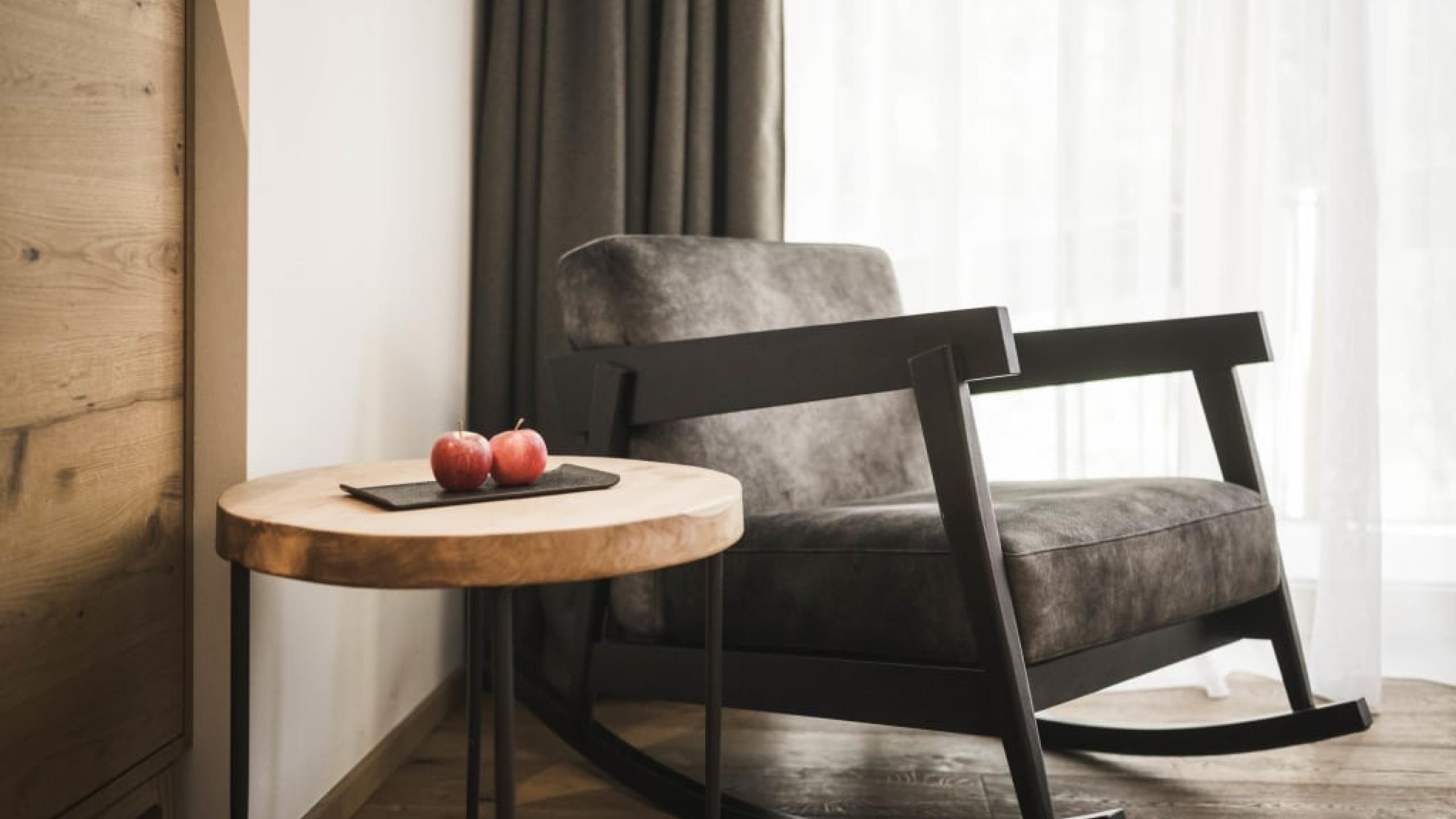 Wohn-Schlafzimmer de luxe im Chalet-Stil mit 40 m² und 10 m² Balkon, Naturholzausstattung und Naturholzboden. Kingsize-Doppelbett, Chaise Longue oder Schaukelsessel, Schreib-/Arbeitstisch, Wohn-Badezimmer mit Schrank und großzügiger Relax-Dusche, WC und Bidet getrennt, Doppelwaschtisch in Marmor, Lady-Schmink-Desk. Minibar mit Nespresso und Tee-Ecke, Telefon, LED Sat-TV, Safe, kostenloses WLAN. Kuschelige Bademäntel, Badetücher, Badeschuhe, Rucksack. Überdachter Balkon zur Westseite mit Nachmittagssonne und privater kombinierter Finnischer- und Infrarotsauna. Garagenplatz inkludiert. Keine Haustiere erlaubt. Die Bilder dienen als Beispiel, die Möblierung oder der Grundriss können variieren.