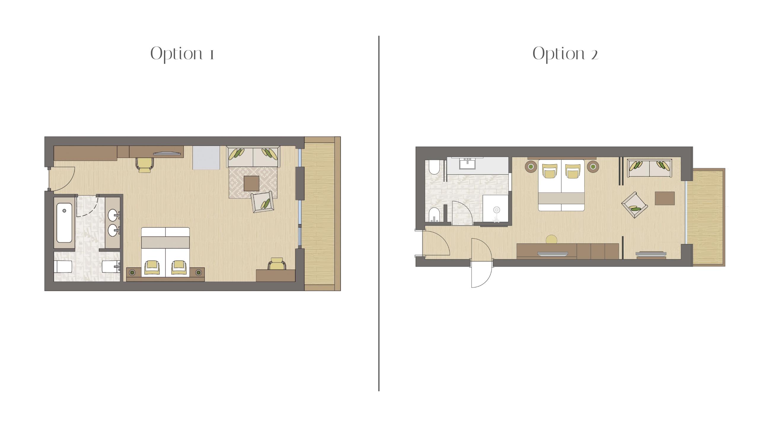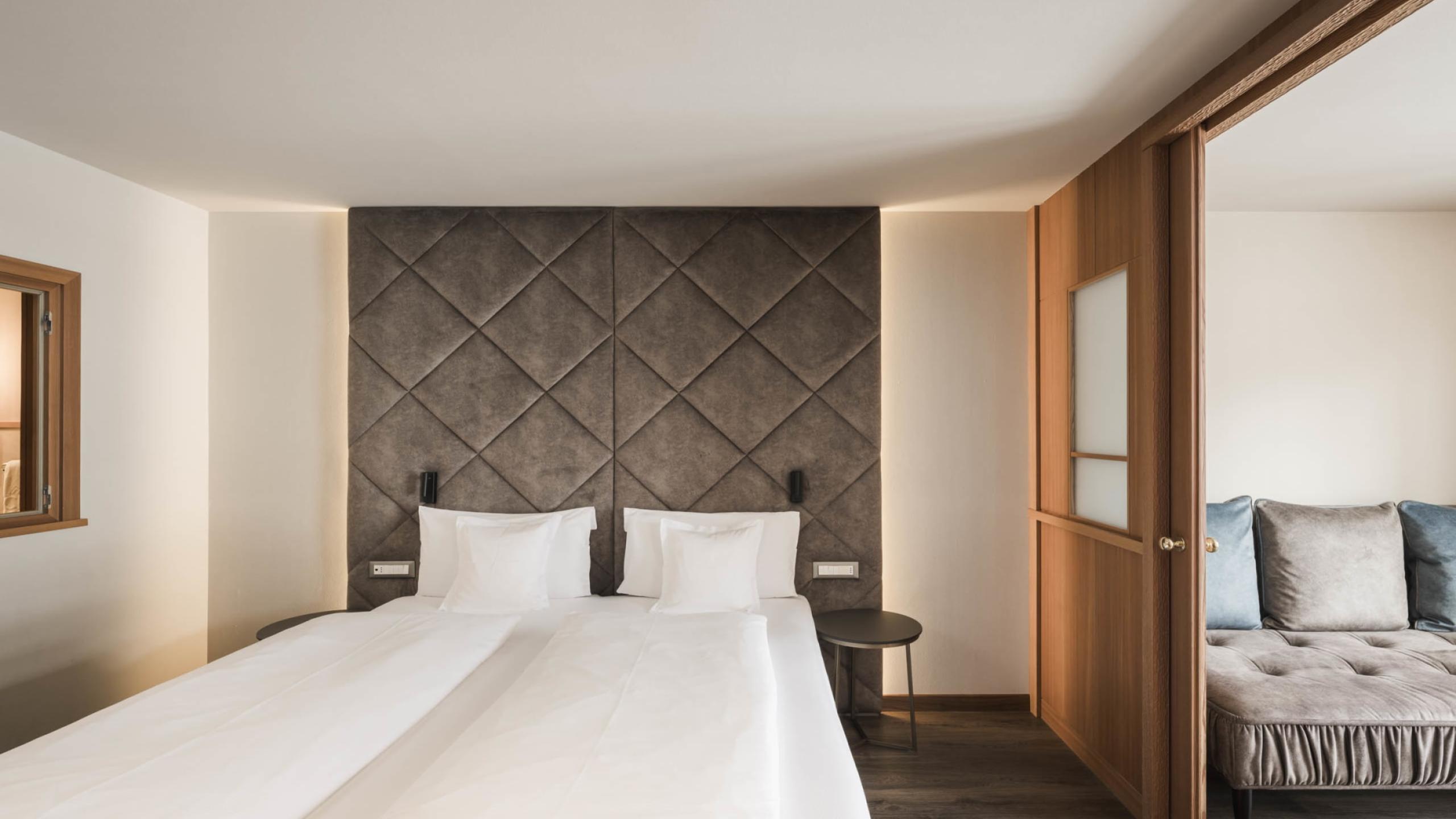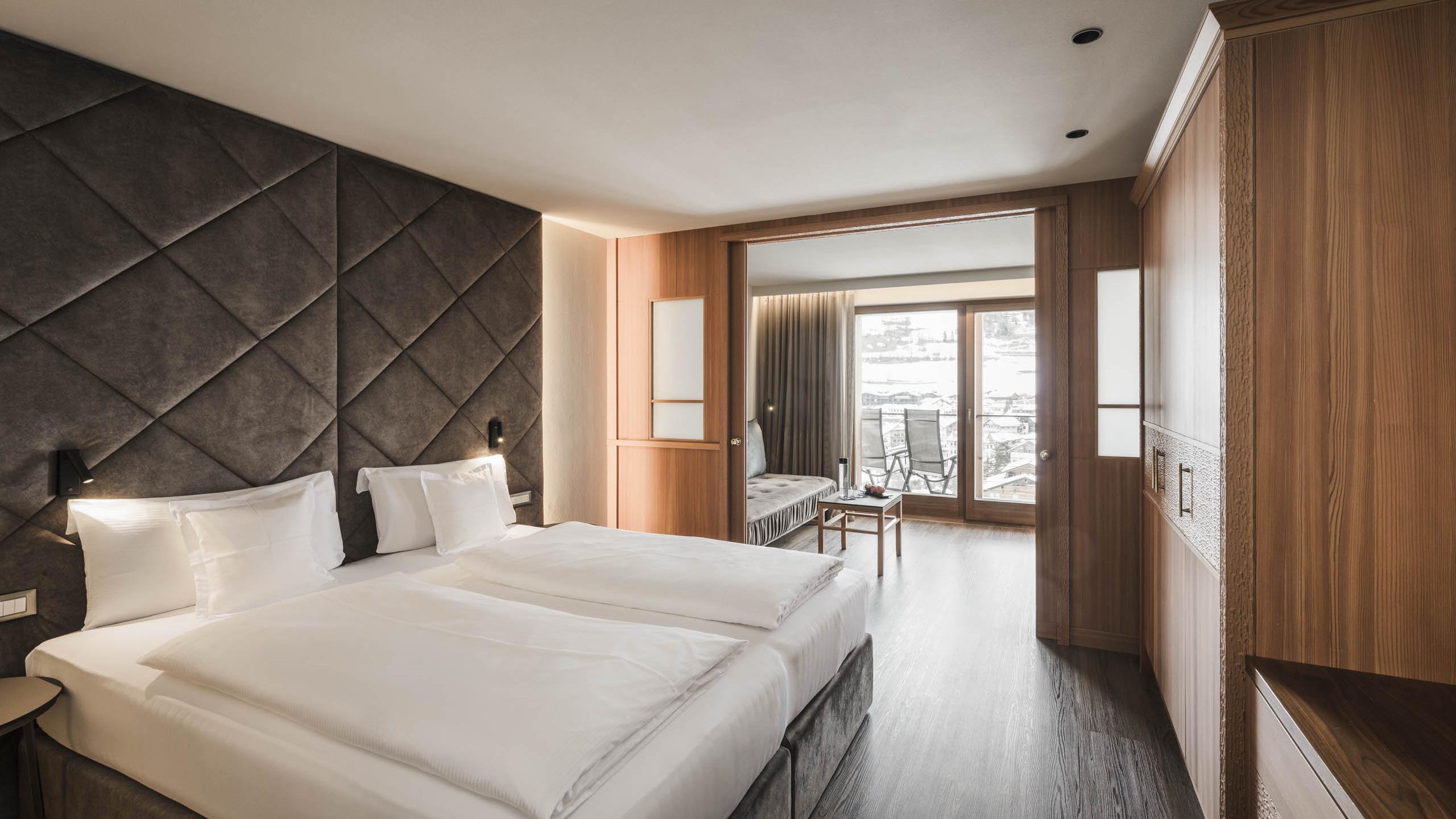 Wohn-Schlafzimmer im modernen alpinen Style mit 37 m², Holzausstattung und Holzboden. Chaise Longue, Kingsize-Doppelbett, Schreib-/Arbeitstisch, Bad mit Dusche oder kombinierter Badewanne/Dusche, WC und Bidet, Waschtisch oder Doppelwaschtisch in Marmor, Kosmetikspiegel, Föhn, Telefon, LED Sat-TV, Safe, Minibar, kostenloses WLAN. Kuschelige Bademäntel, Badetücher, Badeschuhe, Rucksack. Einige Lavarella De Luxe Zimmer verfügen über ein Separée. Balkon oder Terrasse mit Panoramablick. Garagenplatz inkludiert. Die Bilder dienen als Beispiel, die Möblierung oder der Grundriss können variieren.
