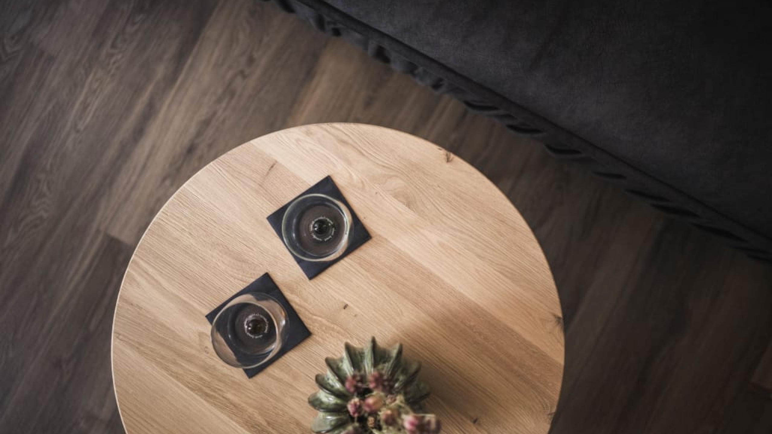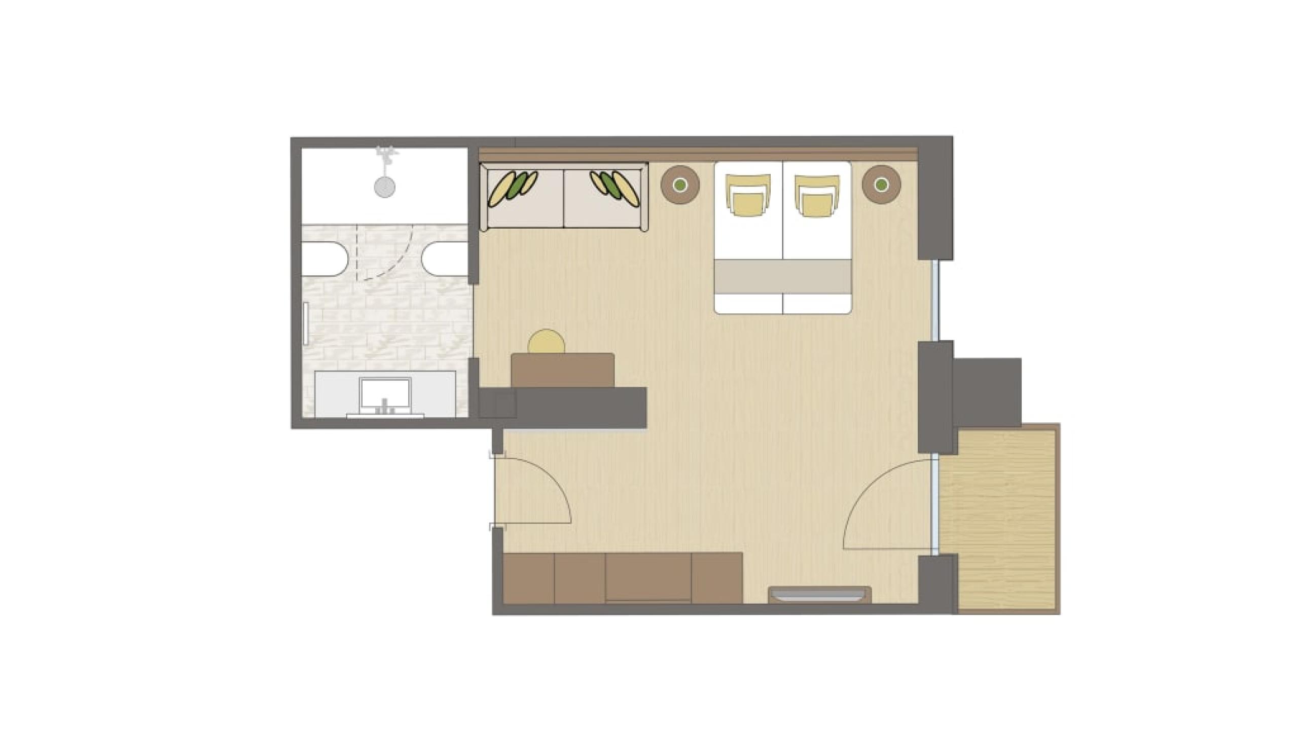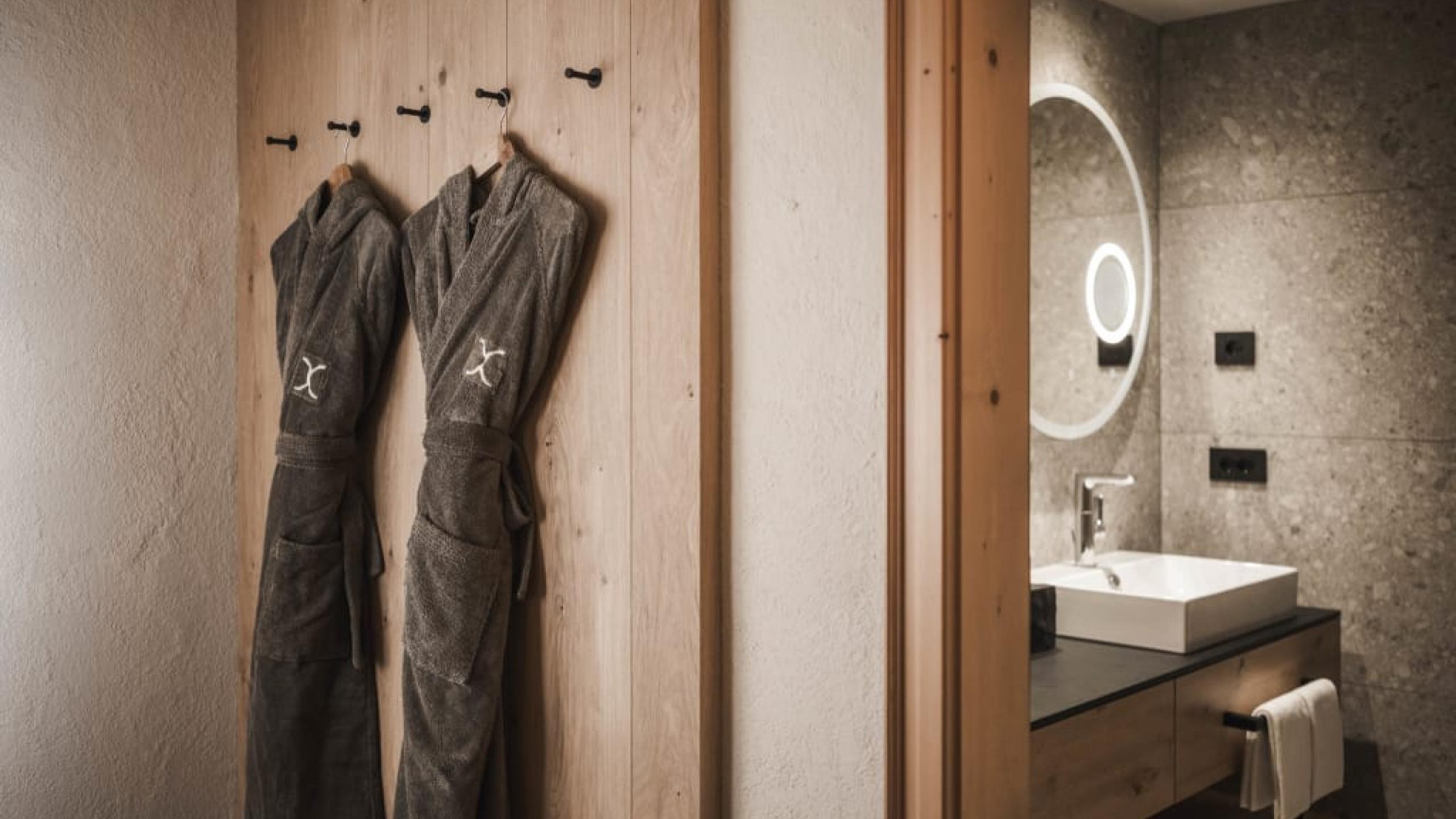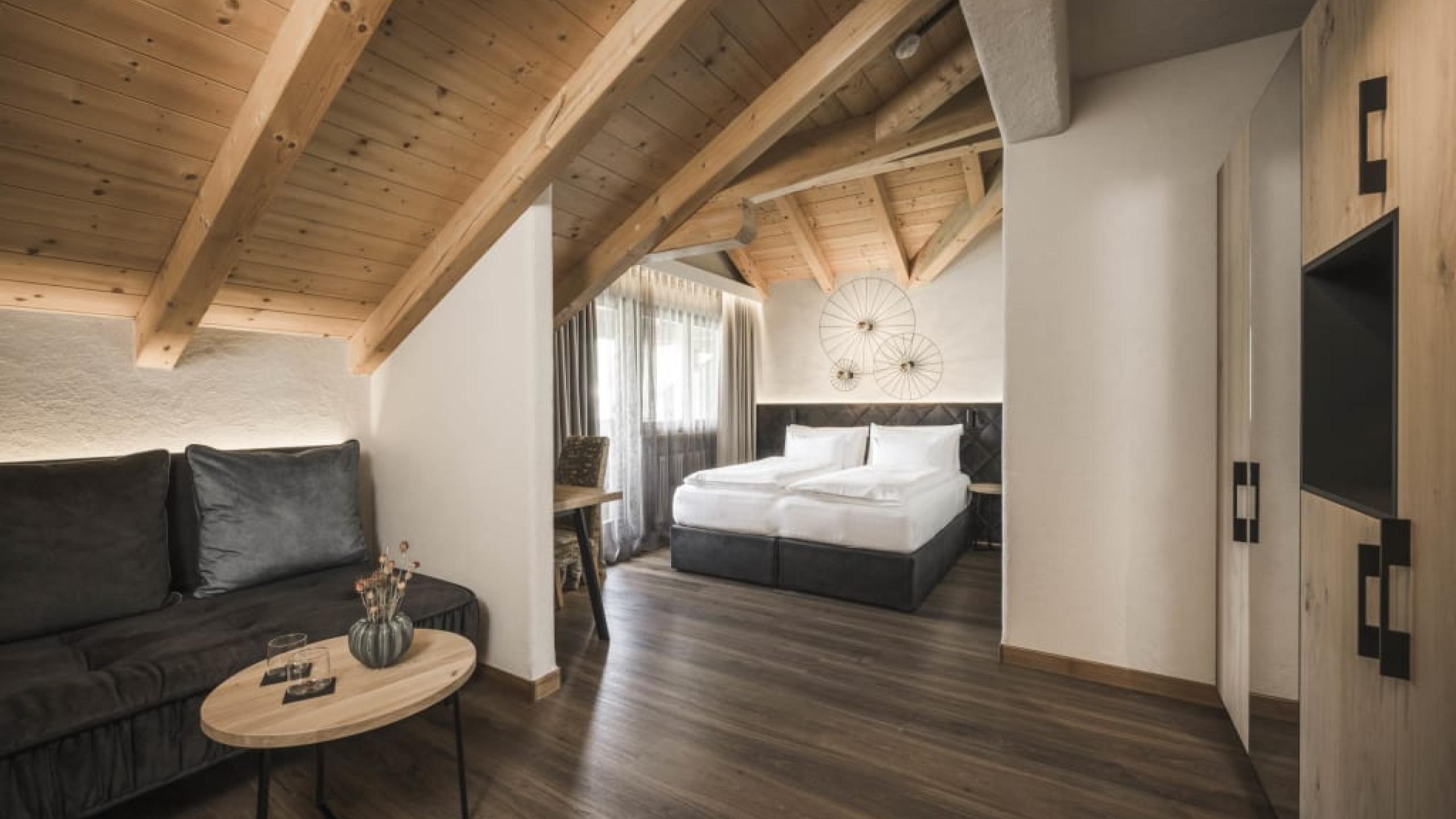 Wohn-Schlafzimmer im modernen alpinen Style mit 33 m², Holzausstattung und Holzboden. Kingsize-Doppelbett, Schreib-/Arbeitstisch, Badezimmer mit Dusche, WC und Bidet, Waschtisch, Kosmetikspiegel, Föhn, Telefon, Sat-TV, Safe, Minibar, kostenloses WLAN. Kuschelige Bademäntel, Badetücher, Badeschuhe, Rucksack. Balkon mit Panoramablick. Die Bilder dienen als Beispiel, die Möblierung oder der Grundriss können variieren.
